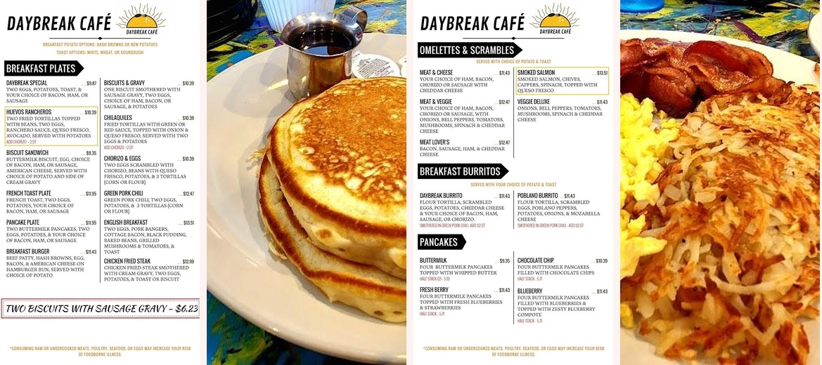 The menu at Daybreak Cafe is a delightful exploration of breakfast and lunch favorites. Offering 49 dishes, it caters to a wide range of tastes and preferences. Highlights include the All Day Breakfast Plates, where classics like the Daybreak Special and the Green Pork Chili Plate stand out. The breakfast sandwich selection features delightful options like the Breakfast Burger and Biscuit Sandwich. If burritos are your thing, the Poblano and Daybreak Burritos are popular picks that pack a flavorful punch. The All Day menu ensures that whether it’s brunch or a quick lunch, there's something for everyone, including small plates, salads, and even desserts. The average price per dish is reasonable at $12.36, making it accessible for daily visits. Daybreak Cafe exemplifies comfort food that celebrates local ingredients, inviting guests to enjoy a satisfying culinary experience at any time of the day.